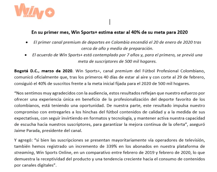 Ante los rumores, el Presidente de Win Sports decidió entregar un balance de suscriptores tras 40 días desde que salió al aire esta modalidad ‘premium’ para ver el fútbol colombiano. Según Jaime Parada, ya se cumplió el 40% de la meta planteada solo para el año 2020.