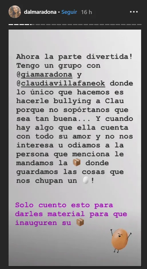 Por último, le dedicó un mensaje con chiste interno incluido a sus hijas Dalma y Giannina: “Y ustedes dos@giamaradonay@dalmaradonaOJO con la caja”.
