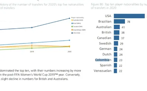 Algo para destacar es que el fútbol femenino colombiano también se posiciona entre los mejores y Colombia ocupó el puesto nueve en mayor cantidad de transferencias internacionales realizadas en 2020.