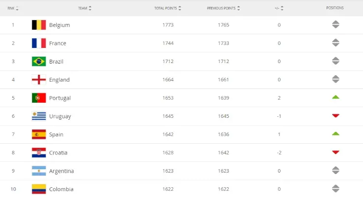La gran novedad de esta actualización tiene que ver con el ascenso de la Selección de Portugal, vigente campeón de Europa. Los lusos, de la mano de Cristiano Ronaldo y Joao Félix, ganaron dos posiciones y ahoran son quintos.