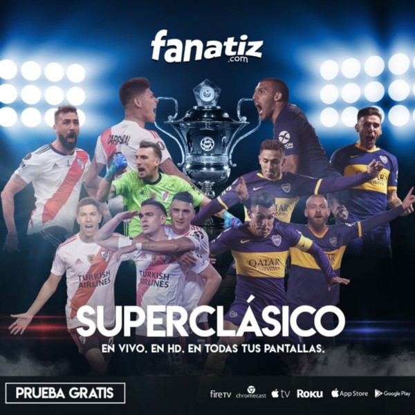 A través de Fanatiz se podrá disfrutar del Superclásico en los siguientes dispositivos: Web, apps paraiOSyAndroid, y Smart TVs Roku, Apple TV, Chromecast y Amazon Fire TVa partir de una suscripción que posee 7 días de prueba gratuita y no tienecosto de cancelación.