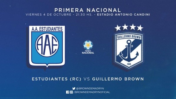 El partido de Estudiantes RC vs. Guillermo Brown por la fecha 8 de la Primera Nacional será este viernes 4 de octubre a las 21:30 horas locales en elEstadio Ciudad de Río Cuarto Antonio Candini.
