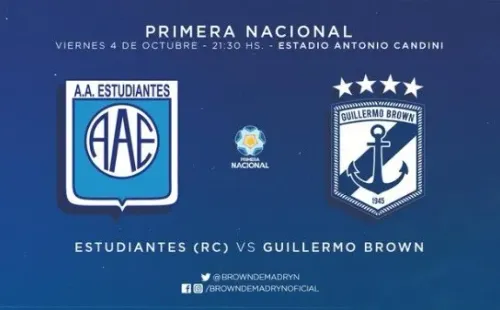 Estudiantes de Río Cuarto recibe a Guillermo Brown de Puerto Madryn este viernes 4 de octubre por la octava fecha de la Primera Nacional.