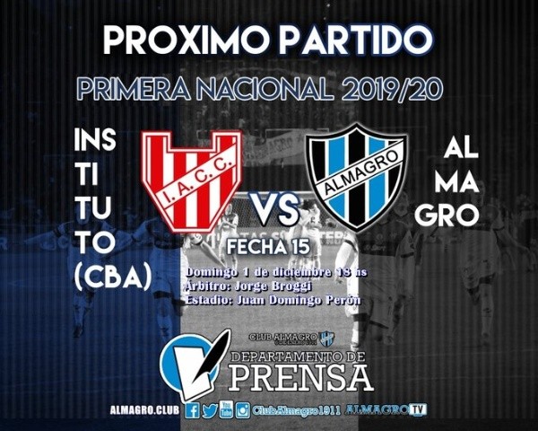 ¿Cuándo es el partido de Instituto vs. Almagro?