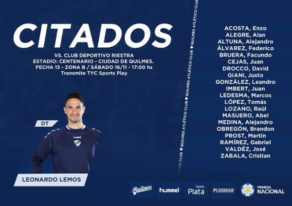 Quilmes y Deportivo Riestra serán rivales este sábado en un duelo correspondiente a la fecha 13 de la Primera Nacional.