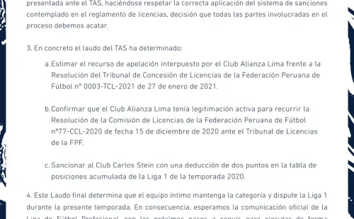 Confirmando la decisión del Tribunal de Arbitraje Deportivo, Alianza Lima, entre otras cosas, manifestó: “El día de hoy, 17 de marzo del 2021, se ha recibido el fallo favorable a la apelación presentada ante el TAS, haciéndose respetar la correcta aplicación del sistema de sanciones contemplado en el reglamento de licencias, decisión que todas partes involucradas en el proceso debemos acatar”.