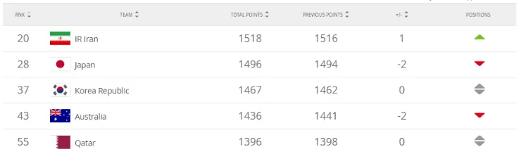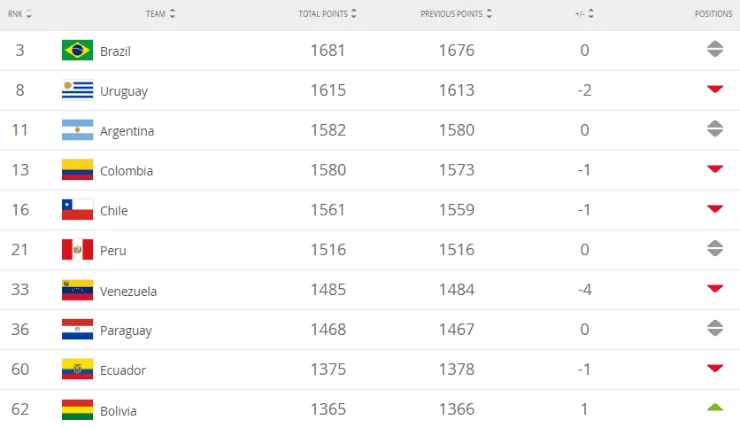 Para cerrar con los dos invitados a la Copa América, mientras que Japón descendió dos ubicaciones y quedó compartiendo el puesto 28 conIrlanda del Norte, Qatar se mantuvo fijo en el puesto 55.