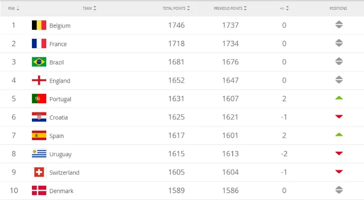 En el podio del mismo todo sigue igual, dado que Bélgica, Francia y Brazil siguen posicionados en los primeros tres puestos de la lista.