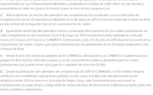 3. Igualmente, las fechas del calendario fueron socializadas directamente con los clubes participantes de cada competencia en dos ocasiones: (i) el 13 de mayo de 2019 durante la reunión realizada en el día del sorteo de Octavos de Final de la CONMEBOL Libertadores; y (ii), el 11 de julio de 2019 durante la reunión de la Subcomisión de Clubes, órgano que está conformado por los presidentes de los 16 clubes clasificados a los Octavos de Final.