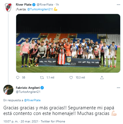 Exteriorizando un profundo agradecimiento por el gesto que los planteles de River y Godoy Cruz tuvieron a raíz de su dolorosa pérdida, Angileri, a través de su cuenta oficial de Twitter, no tardó en agradecerles a los mismos.