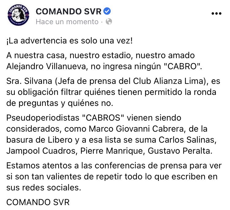 Comando Svr, por ejemplo, ha apuntado contra algunos periodistas. Más alla de la acciones que puedan tomar, le hicieron un llamado a la jefa de prensa de Alianza Lima.