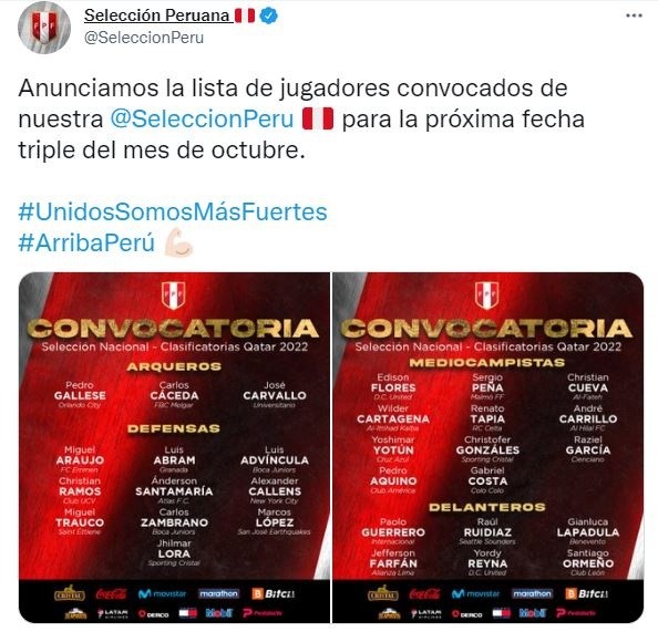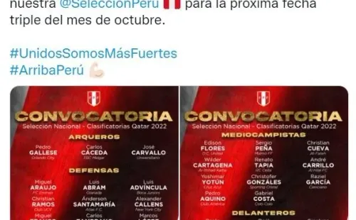 Arqueros: Pedro Gallese (Orlando City-EAU), José Carvallo (Universitario) y Carlos Cáceda (Melgar).