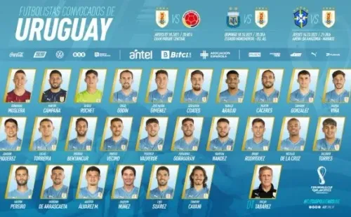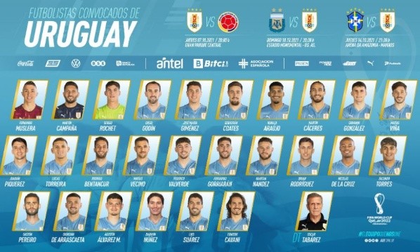 Delanteros: Brian Rodríguez (Los Ángeles-USA), Luis Suárez (Atlético de Madrid-ESP), Gastón Pereiro (Cagliari-ITA), Darwin Núñez (Benfica-POR), Edinson Cavani (Manchester United-GBR) y Agustín Álvarez Martínez (Peñarol).