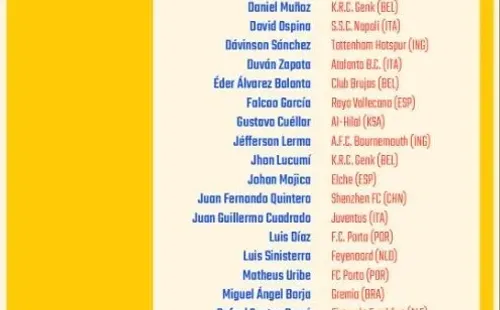 Delanteros: Duván Zapata (Atalanta-ITA), Falcao García (Rayo Vallecano-ESP), Luis Díaz (Porto-POR), Luis Sinisterra (Feyenoord-NED), Miguel Borja (Gremio-BRA), Rafael Borré (Eintracht Frankfurt-GER) y Roger Martínez (América-MEX).