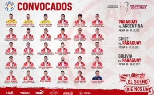 Delanteros: Antonio Sanabria (Torino-ITA), Carlos González (Tigres-MEX), Hernán Pérez (Al Alhi Doha-CAT), Braian Samudio (Toluca-MEX), Miguel Almirón (Newcastle-GBR), Luis Amarilla (Liga de Quito-ECU), Óscar Cardozo (Libertad), Julio Encizo (Libertad).