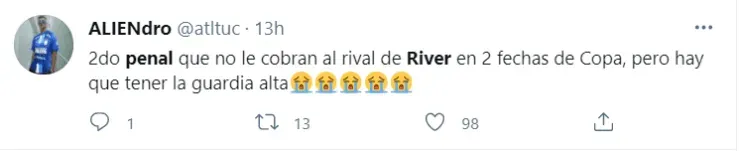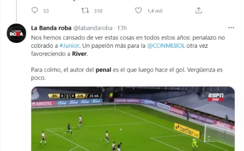 En Twitter se armó una guerra: fanáticos del conjunto de Núñez defendiendo a su equipo, argumentando que estas cosas siempre pasan y que también hubieron acciones en contra de los dirigidos por Marcelo Gallardo que el juez no tuvo en cuenta. Por otro lado, aparecieron los hinchas del club de Barranquilla, llenos de furia por lo sucedido.