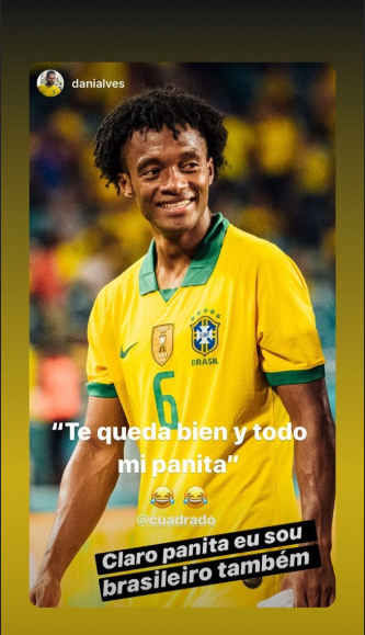 Dani Alves vio la foto del colombiano con los colores brasileños y lo trolleó en las historias de Instagram.