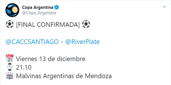 + Tweet de la cuenta oficial de la Copa Argentina con todos los detalles del partido definitorio: