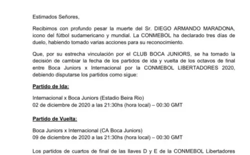 ¡Se suspendió el partido! A consecuencia del fallecimiento de Diego Armando Maradona, el encuentro de Internacional vs. Boca por la ida de los octavos de final de la Copa Libertadores no se disputará hoy como esta planeado, sino que será reprogramado para el próximo miércoles 2 de diciembre a las 21:30 horas locales. La vuelta será el 9/12 en La Bombonera.