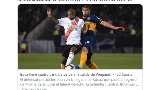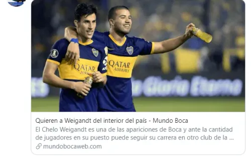 La intención de la directiva Xeneize es que Weigandt se vaya cedido, aunque no descartarían la posibilidad de venderlo si llega una buena oferta desde Brasil. Cubiertos están, porque la gestión Angelici le dejó al jugador una cláusula de rescisión de 15 millones de euros.
