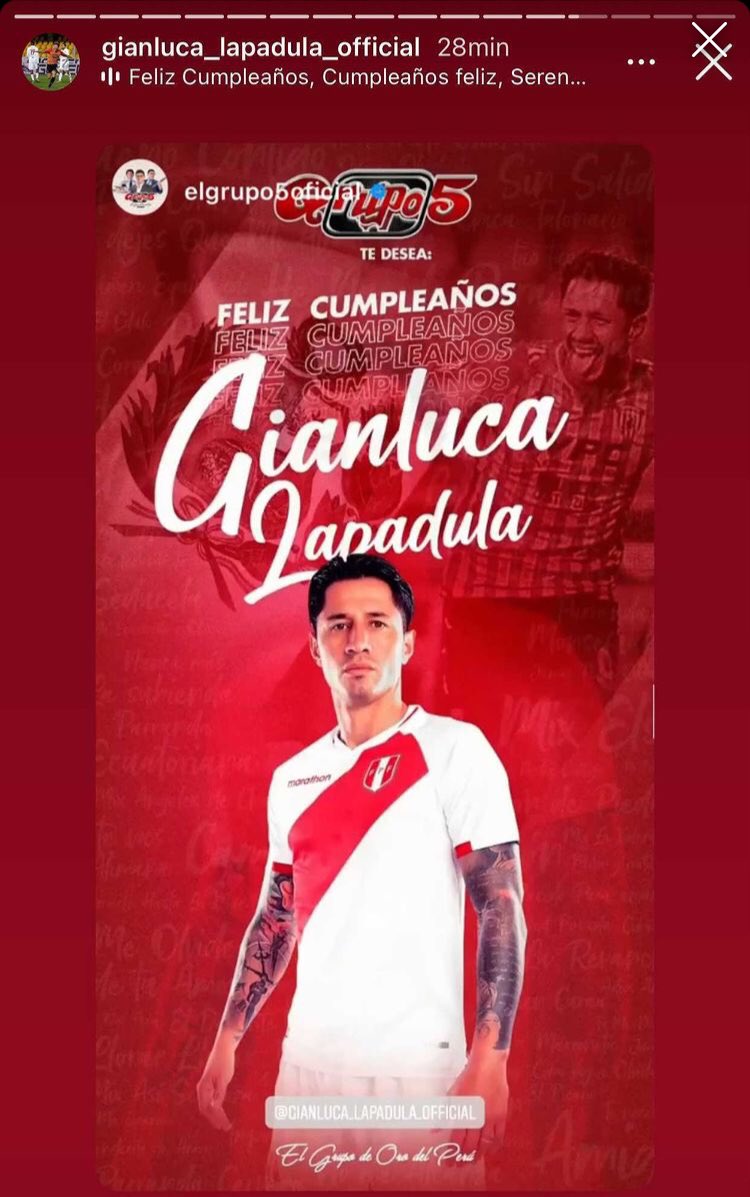 Lo que más llamó la atención, sin embargo, fue un saludo del grupo más reconocido del Perú: Grupo 5. Los cumbieros le hicieron una imagen y lo taggearon. El nacido en italia lo correspondió compartiendo la historia en su perfil.