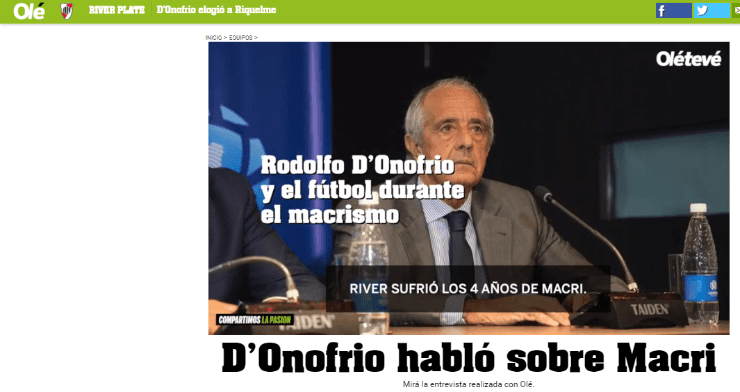 En diálogo con Olé, rememorando la gestión del ex presidente de Boca a nivel país, Rodolfo D’Onofrio, máximo mandatario de River, disparó:“River sufrió los 4 años de Macri. ¿Por qué? Porque hubo un poder desmedido desde el lado de Boca”.