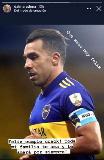 “¡Feliz cumple crack! ¡Toda mi familia te ama y te amará por siempre!”, escribió Dalma y cerró: “Que seas muy feliz”. Además, la historia fue acompañada de una foto de Carlitos utilizando la cinta de capitán con la imagen de Diego.