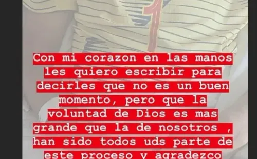 “Con mi corazón en las manos les quiero escribir para decirles que no es un buen momento, pero que la voluntad de Dios es más grande que la de nosotros, han sido todos ustedes parte de este proceso y agradezco las oraciones. Mi familia y yo seremos la fuente principal para dar cualquier información. Nuevamente gracias por su respeto y comprensión, pero esto no es una primicia, esto va más alla”, escribió en Instagram.