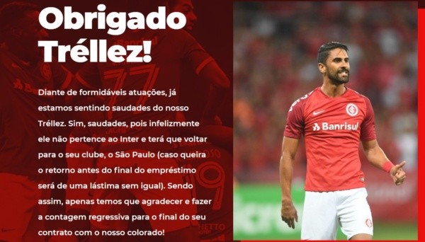 Con tono sarcástico, la página Obrigado Tréllez (que traduce ‘Gracias, Tréllez’) le agradece al jugador ‘cafetero’ por sus “actuaciones formidables” con la camiseta del Inter y recuerdan que “desafortunadamente” sus derechos deportivos no pertenecen a su club, sino al Sao Paulo, por lo que tendrá que regresar allí cuando termine su préstamo.