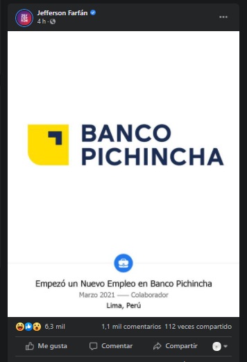Y es que la Foquita Farfán fue presentando en el equipo del Banco Pichincha, empresa que pariticipa activamente en Alianza Lima. El propio Farfán lo comunicó en su Facebook.
