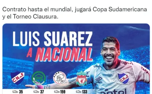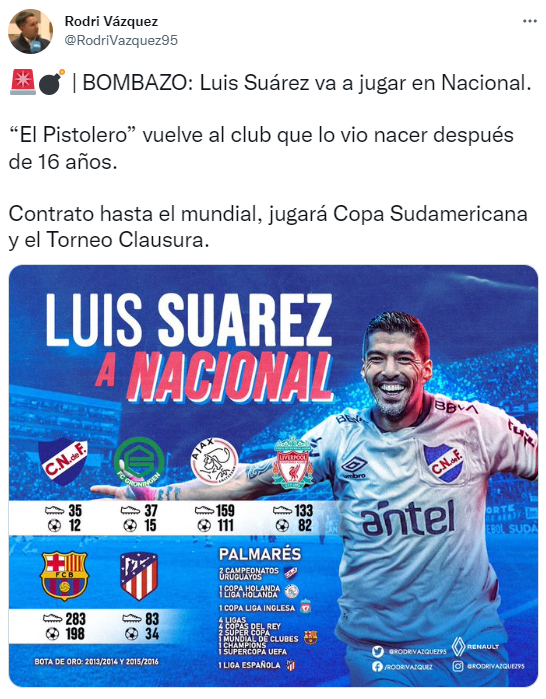 El periodista explicó que será con un contrato hasta el Mundial de Qatar 2022, tiempo en el que afrontará el Torneo Clausura y la Copa Sudamericana. Por el certamen internacional, Nacional tiene por delante la serie ante Goianiense por los cuartos de final. De oficializarse, Suárez tendrá dónde mantenerse a punto para la cita mundialista, regresando al club en el que debutó en 2005 y disputó un total de 35 partidos, con 12 goles.