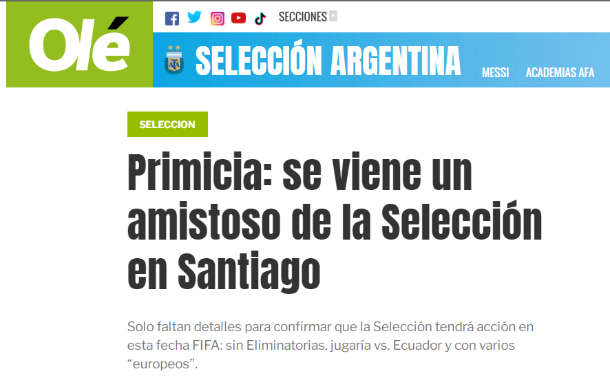 Según informóDiario Olé, el conjunto nacional de Lionel Scaloni se enfrentaría a laSelección de Ecuardode Gustavo Alfaro en el Estadio Único de Santiago del Estero, donde hace unos días se jugó la Supercopa Argentina entre Racing y River.