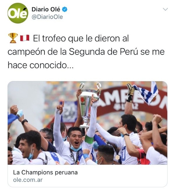 “El trofeo que le dieron al campeón de la Segunda de Perú se me hace conocido“, escribieron para comenzar en twitter. “La champions peruana”, pusieron después.