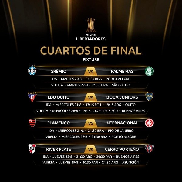 Es atinado recordar que la primera semifinal saldrá de los cruces entre River Plate vs. Cerro Porteño y Boca Juniors vs. Liga de Quito, mientras que la segunda de Gremio vs. Palmeiras y Flamengo vs Inter.