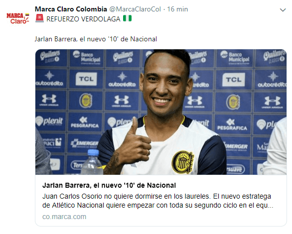 El representante del jugador,Kormac Valdebenito, confirmó la llegada de Barrera en diálogo con Marca Colombia. Estará llegando en las próximas horas a Medellín, presentará exámenes médicos y se convertirá en nuevo refuerzo del Verdolaga.
