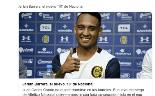 Ya está todo preparado para que Jarlan Barrera se convierta en nuevo jugador de Atlético Nacional. El jugador regresa al FPC seis meses después de haber salido al fútbol de Argentina con Rosario Central.