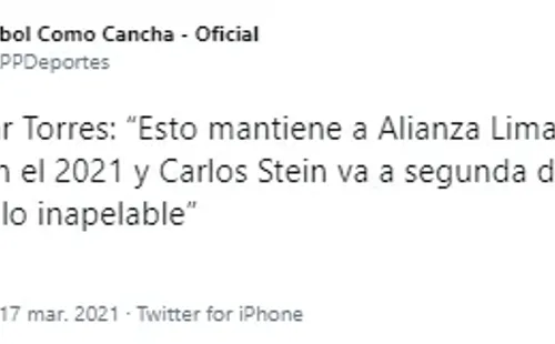 En diálogo con Fútbol Como Cancha, César Torres, directivo de Alianza, confirmó la novedad proveniente desde el TAS y aseguró que el club estará presente en la máxima categoría del fútbol peruano este año.“Esto mantiene a Alianza Lima en la Liga 1 en el 2021 y Carlos Stein va a segunda división. Es un fallo inapelable”, afirmó.