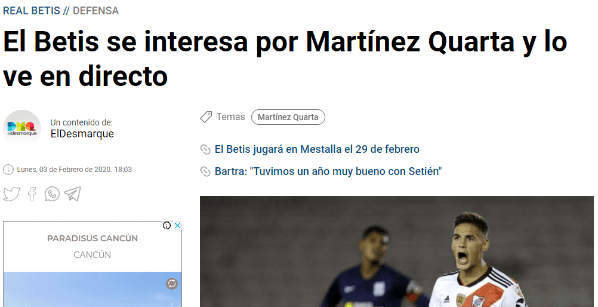 Pese a que hace un par de días cerró el mercado de fichajes en Europa y Argentina, en Betis no han tirado la toalla en sus intenciones de contratar a Lucas Martínez Quarta.