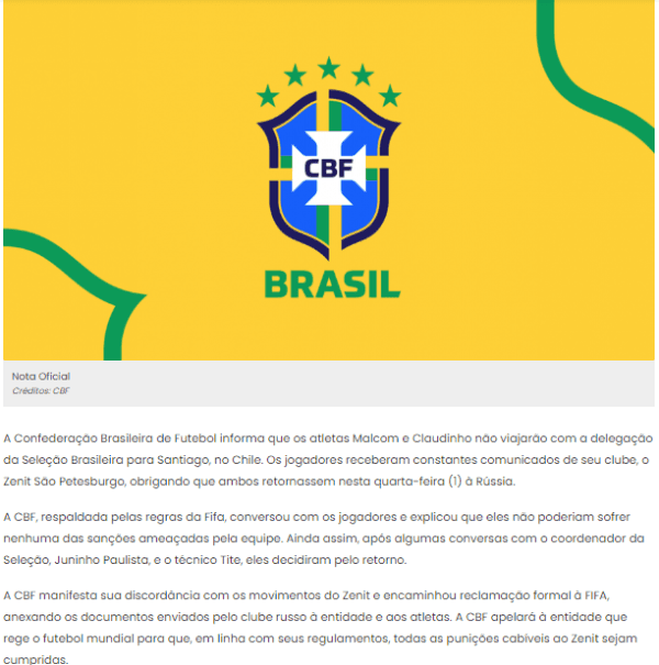 “Los jugadores recibieron constantes comunicaciones de su club, el Zenit de San Petersburgo, obligando a ambos a regresar este miércolesa Rusia.La CBF, apoyada por las reglas de la FIFA, habló con los jugadores y explicó que no podrían sufrir ninguna de las sanciones que amenaza el equipo. Aún así, tras algunas conversaciones con el coordinador de la Selección, Juninho Paulista, y el técnico Tite, decidieron volver“, informa el comunicado.