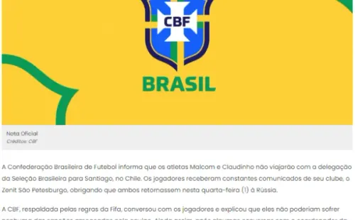 Este miércoles, La Confederación Brasileña de Fútbol lanzó un comunicado explicando que Malcom y Claudinho no viajarán a Santiago de Chile para el primer duelo ya que tuvieron que regresar a Rusia por pedido de Zenit. El retorno se produce tras dos días de entrenamientos y tras numerosas amenazas de denuncias por parte del club.