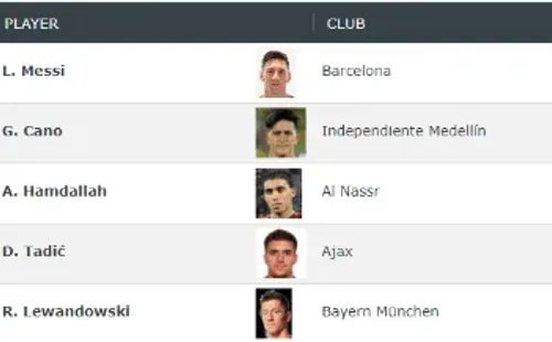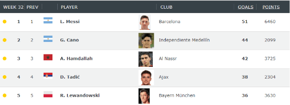 Germán Ezequiel Cano, de Independiente Medellín, quien ha anotado en los últimos 11 meses 44 goles, está en el segundo lugar, solo detrás del argentino Lionel Messi.