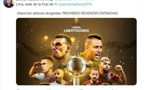 “Lima, sede de la final de la Copa Libertadores 2019”, confirmó con la imagen el periodista. “(Atención señores dirigentes: PROHIBIDO REVENDER ENTRADAS)”, advirtió todavía el comunicador.