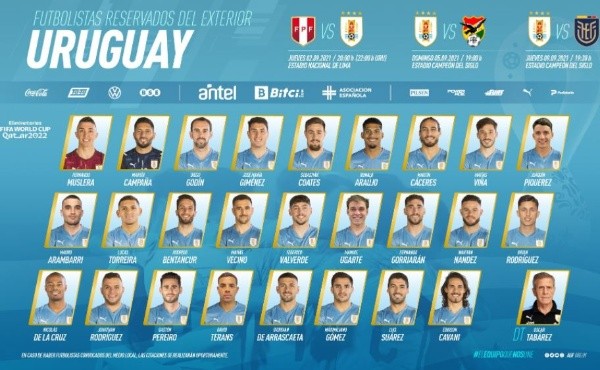 Y es que Cavani Gómez, de 34 años, una de las fichas de experiencia y de gol en el seleccionado Charrúa, fue citado por parte de Oscar Washington Tabárez, el pasado 13 de agosto, junto con 25 compañeros; dentro de los cuales también está Lucas Torreira, futbolista que hace parte de la disciplina de Arsenal.