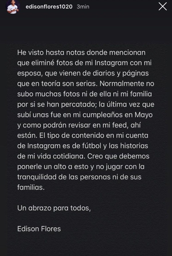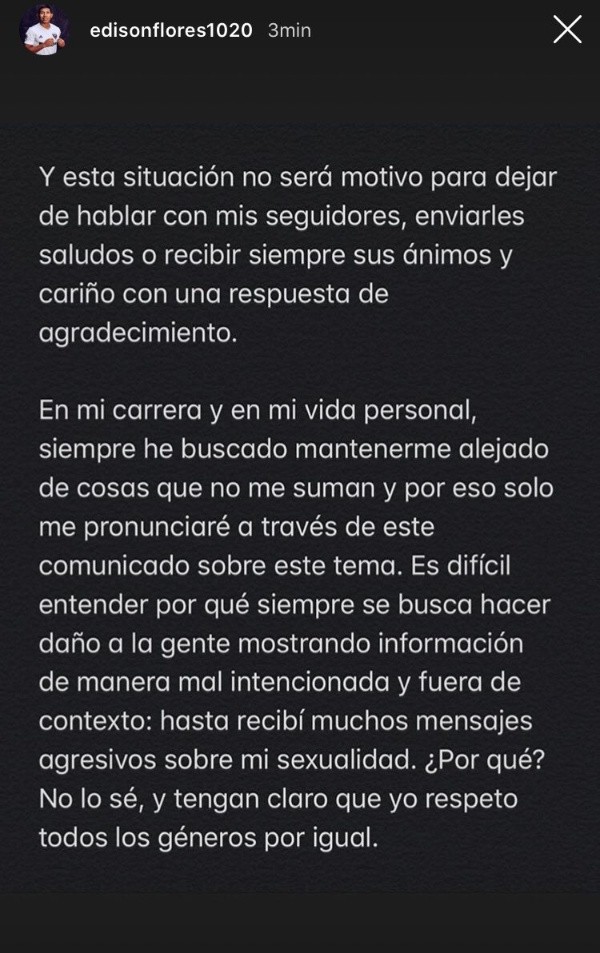 Tras este supuesto escándalo, Edison Flores se expresó por la misma red social: “Las personas que me siguen saben que soy muy activo en esta red social y comento fotos, respondo mensajes y videos que me envían, resposteo historias donde me etiquetan, hasta converso por interno con muchos a los cuales no conozco personalmente”.