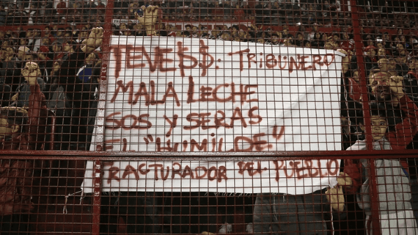 Los fanáticos no creen que haya sido un accidente y con una fuerte bandera, lo dejaron en claro: “Teve$$, tribunero, mala leche. Sos y serás el “humilde” quebrador del pueblo”. Duro.