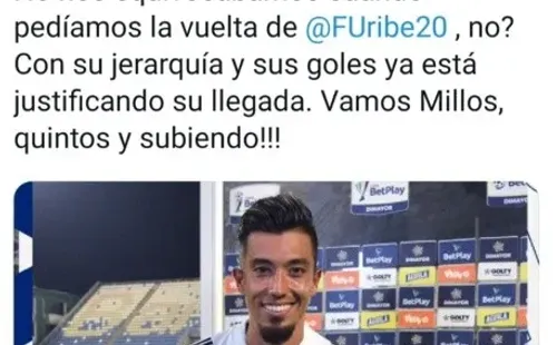 “No nos equivocábamos cuando pedíamos la vuelta de Fernando Uribe,no? Con su jerarquía y sus goles ya está justificando su llegada. Vamos Millos, quintos y subiendo”