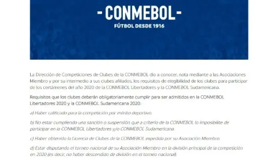Conmebolsorprendió a todos con un comunicado oficial. El mismo, habla de los requisitos para clasificar a la Copa Libertadores o Copa Sudamericana 2020.
