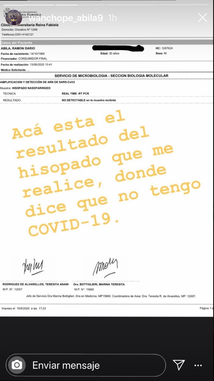 Primero, Wanchope subió una historia a Instagram donde mostró los resultados del hisopado que le dieron negativo.