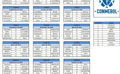 El 2021 comenzará con los duelos como visitante ante Perúy como local de Ecuador, en marzo. Habrá un parate hasta junio y allí se disputarán las jornadas 11 y 12: primero como local de Colombia y luego visitando a Brasila.