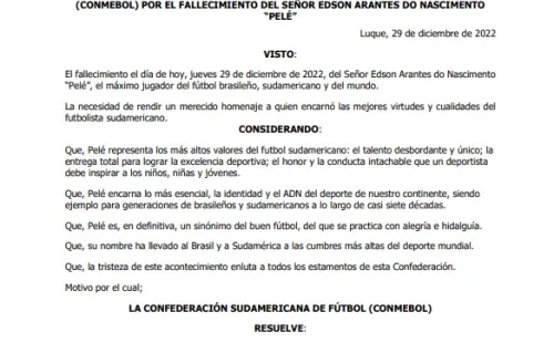 La Conmebol publicó un comunicado declarando duelo por el fallecimiento del Señor Edson Arantes do Nascimento Pelépor cinco días, desde el jueves 29 de diciembre del año 2022 hasta el martes 3 de enero del año 2023.Además, dispuso que,durante el duelo, en la Confederación Sudamericana de Fútbol (CONMEBOL) sean izadas las banderas a media asta yanunció que se realizará un minuto de silencio antes del inicio de cada partido de fútbol a jugarse hasta la finalización de los Octavos de Final de la CONMEBOL Libertadores y de la CONMEBOL Sudamericana.